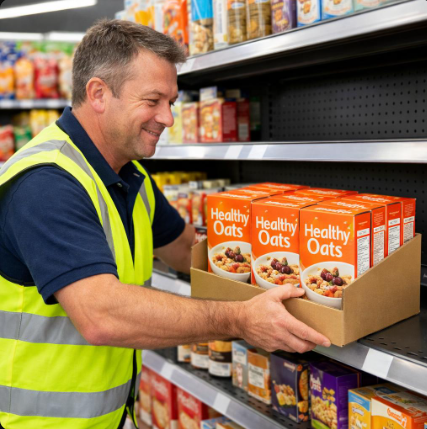 Each store involves the removing of stock from the shelves, installing cardboard trays, assembly and installation of cardboard headers, shelf strips and on the 5 bay stores the removal of a shelf and installation of a bespoke made pick and mix unit.